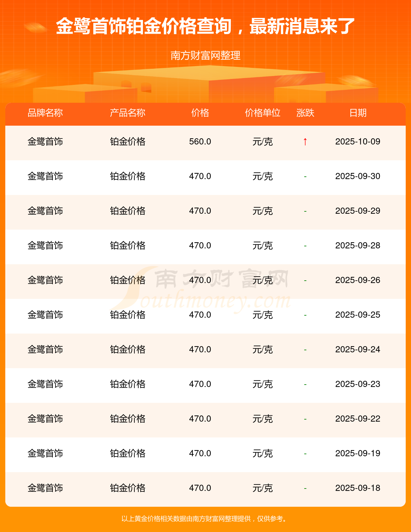 2025年10月10日金鷺首飾鉑金價格今日價格表公布(鉑金價格多少錢一克)
