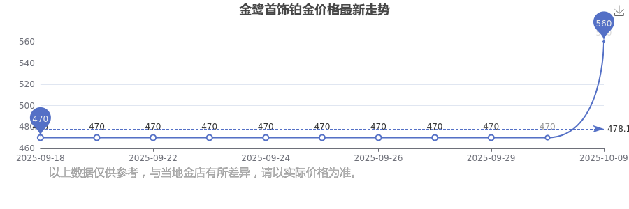 今日(2025年10月10日),金鷺首飾鉑金價格:560.0元/克。