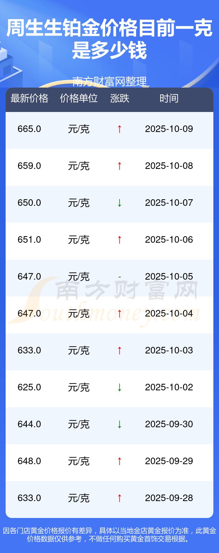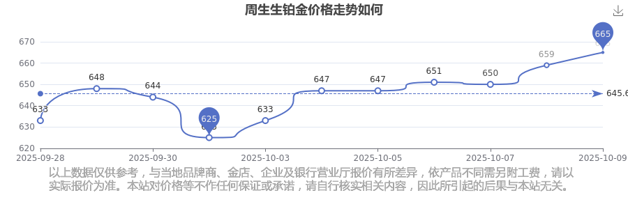 周生生今日 鉑金價格的最新市場行情價為665.0元/克。