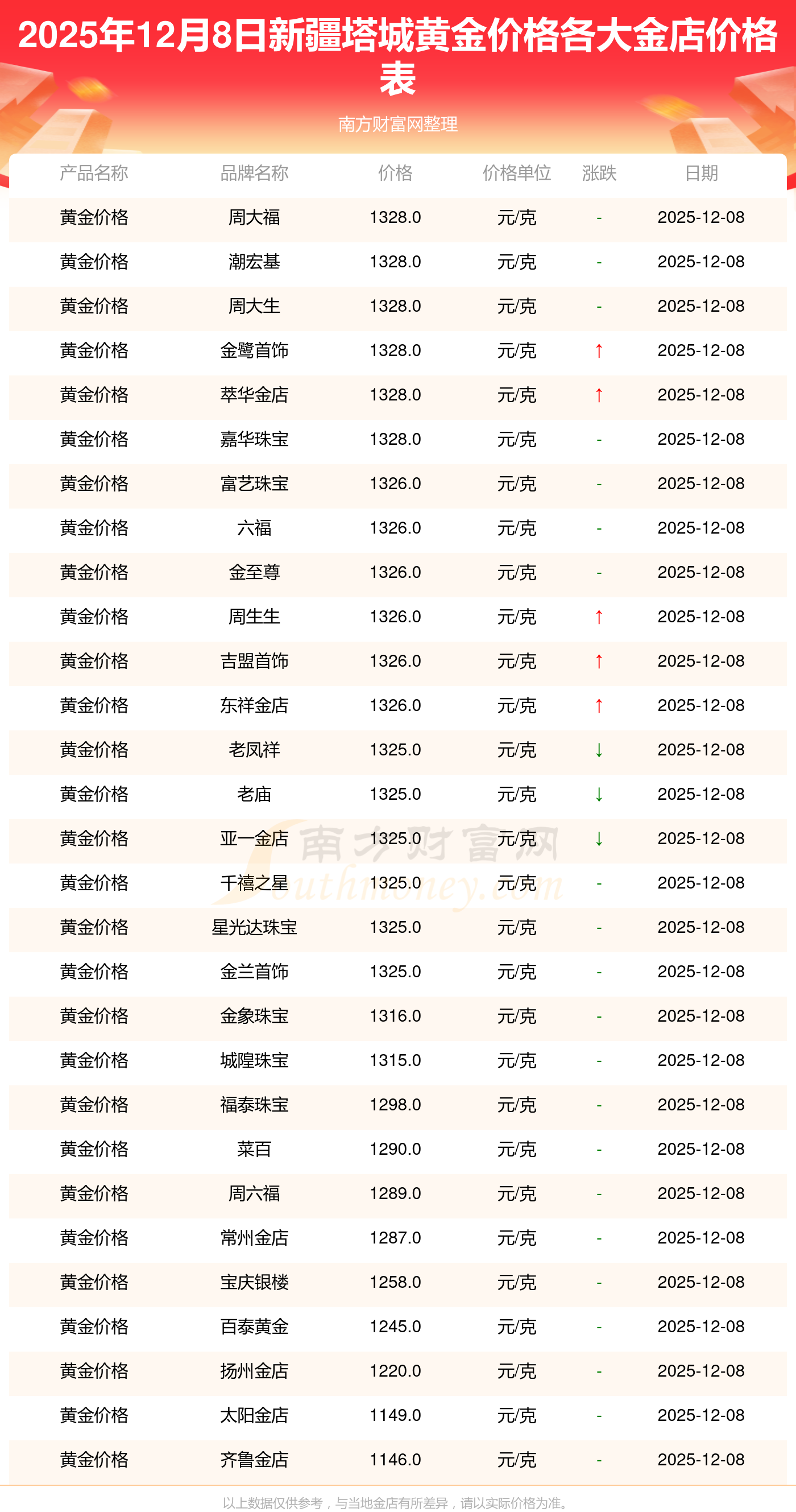 2025年12月8日,新疆塔城謝瑞麟、謝瑞麟、謝瑞麟、謝瑞麟、金銀街、金銀街、金銀街、金銀街、金銀街、金銀街、多邊金都珠寶等各大金店品牌黃金價格今日價格行情最新來了:謝瑞麟1328.0元/克、謝瑞麟46610.0、謝瑞麟13990.0、謝瑞麟42080.0、金銀街1303.0元/克、金銀街1318.0元/克、金銀街1308.0元/克、金銀街13.0元/克、金銀街941.0元/克、金銀街12.0元/克、多邊金都珠寶1274.0元/克。