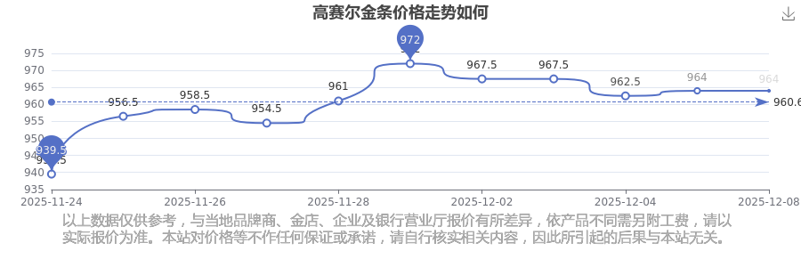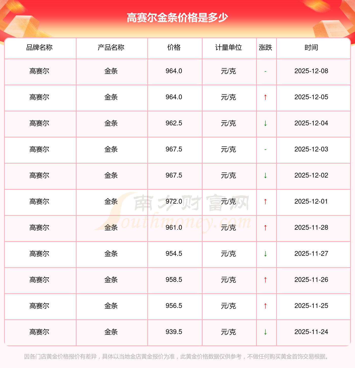 因各門(mén)店黃金價(jià)格報(bào)價(jià)有差異,具體以當(dāng)?shù)亟鸬挈S金報(bào)價(jià)為準(zhǔn),此黃金價(jià)格數(shù)據(jù)僅供參考,不做任何購(gòu)買(mǎi)黃金首飾交易根據(jù)。