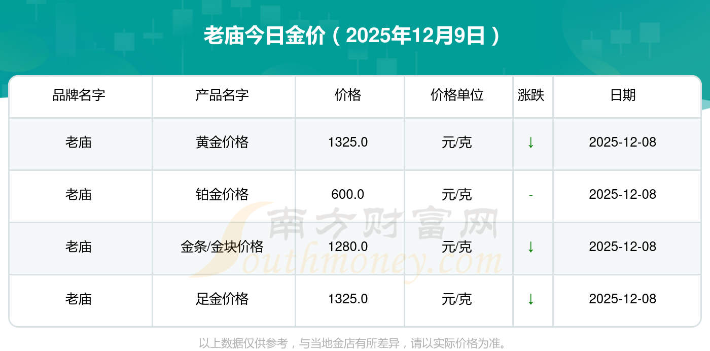 2025年12月9日老廟今日價(jià)格:金飾價(jià)格(內(nèi)地)1328.0元/克,黃金飾品(香港)46610.0,鉑金飾品(香港)13990.0,金條金價(jià)(香港)42080.0,投資金條1303.0元/克,工藝金條1318.0元/克,千足金首飾1308.0元/克,投資銀條13.0元/克,黃金回購(gòu)941.0元/克,白銀回購(gòu)12.0元/克,千足金飾品1274.0元/克。