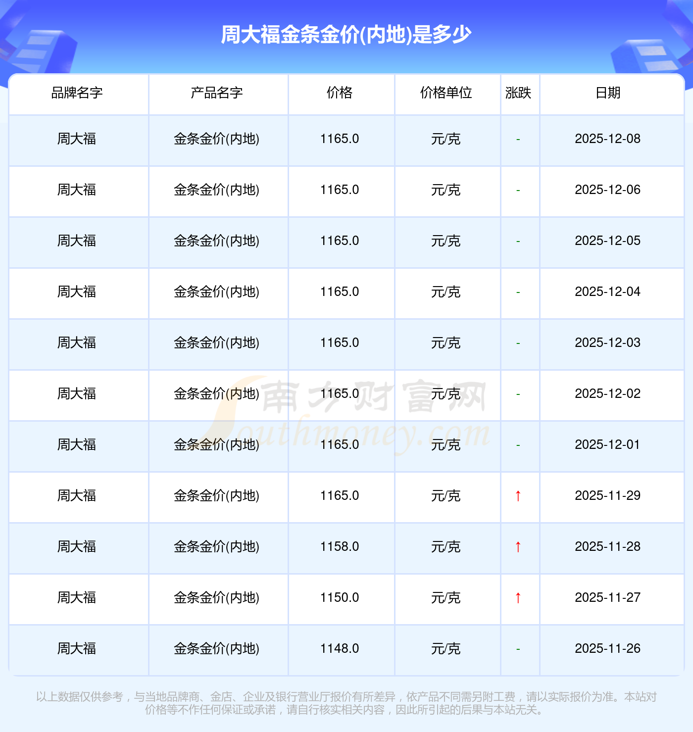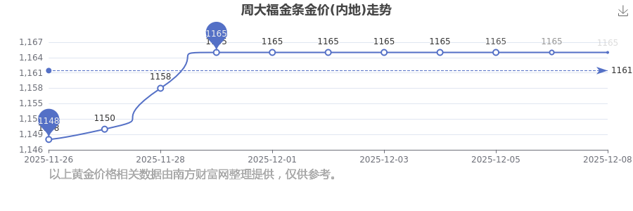 今日周大福金條金價(jià)(內(nèi)地)是1165.0元/克。