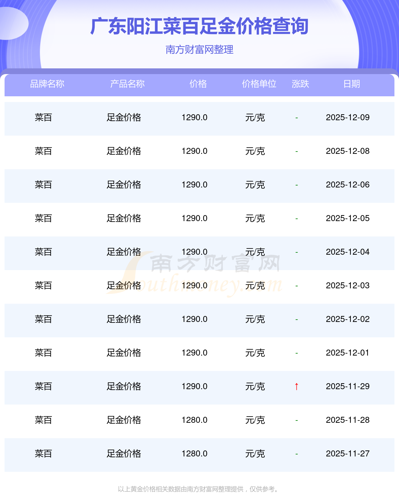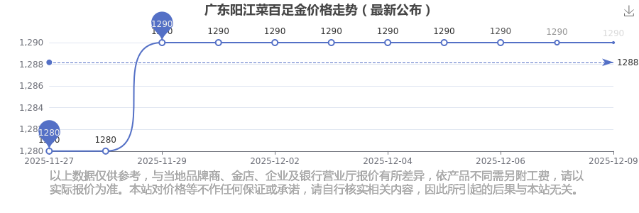 2025年12月9日,廣東陽江菜百所售足金價格,其價格設定為 1290.0元/克。