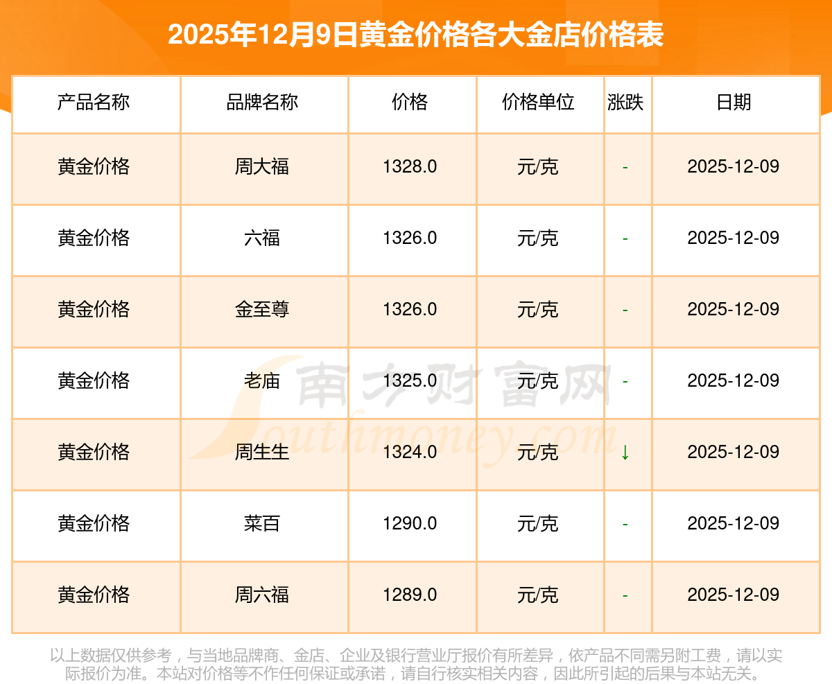 今天是2025年12月9日,周大福、周大福、周大福、周大福、周大福、周大福、周大福、周六福、周六福、周六福、周六福等各大金店品牌黃金價格最新價格如下:周大福1328.0元/克、周大福669.0元/克、周大福1328.0元/克、周大福46520.0、周大福19190.0、周大福41960.0、周大福1165.0元/克、周六福1289.0元/克、周六福613.0元/克、周六福613.0元/克、周六福1184.0元/克。