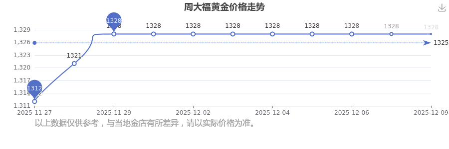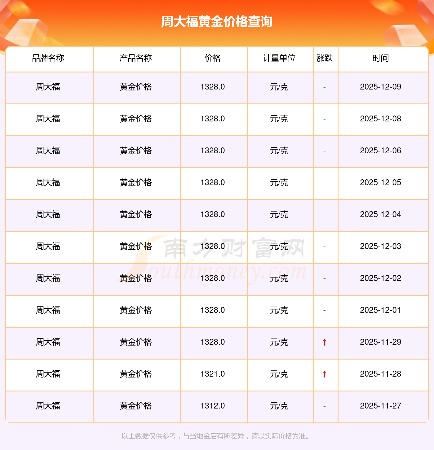 想查詢當(dāng)下黃金價(jià)格,今日黃金一克的價(jià)格是多少呢?黃金每克的價(jià)錢通常來說是多少左右?今日(2025年12月9日),周大福黃金價(jià)格:1328.0元/克。