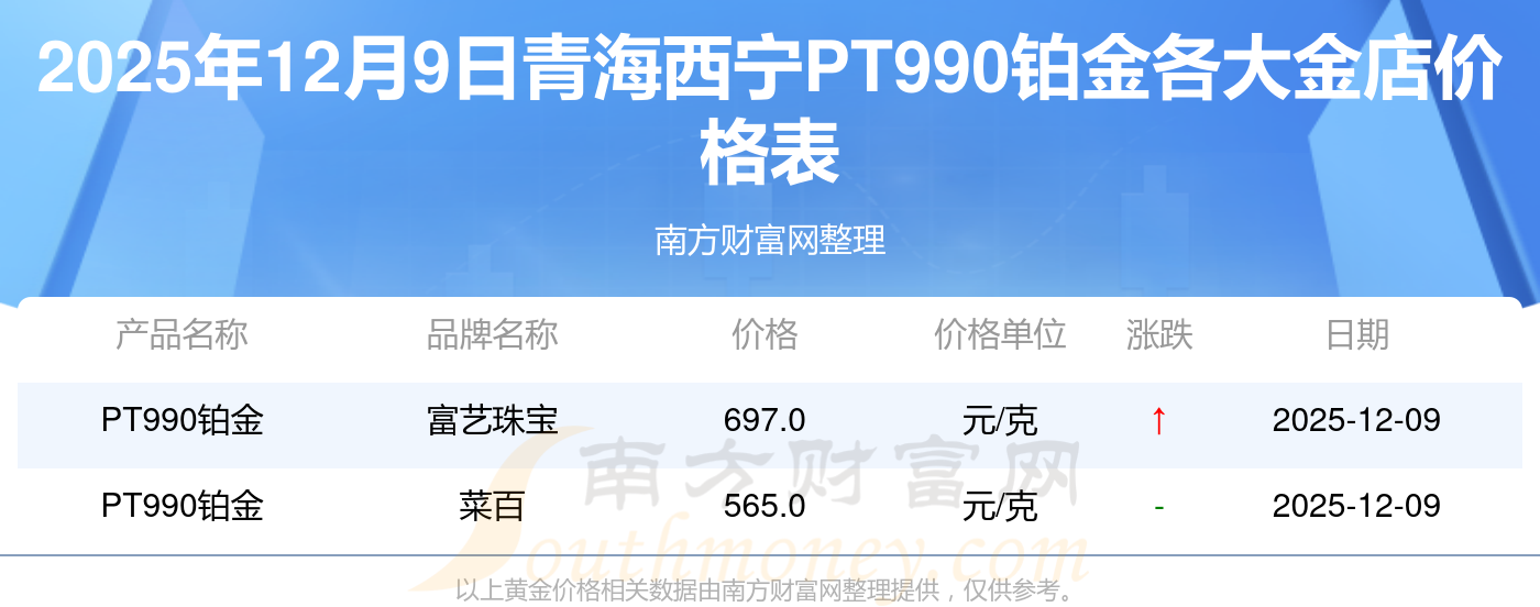 2025年12月9日,青海西寧周大福、周大福、周大福、周大福、周大福、周大福、周大福、周六福、周六福、周六福、周六福等各大金店品牌PT990鉑金今日價格如下:周大福1328.0元/克、周大福669.0元/克、周大福1328.0元/克、周大福46520.0、周大福19190.0、周大福41960.0、周大福1165.0元/克、周六福1289.0元/克、周六福613.0元/克、周六福613.0元/克、周六福1184.0元/克。