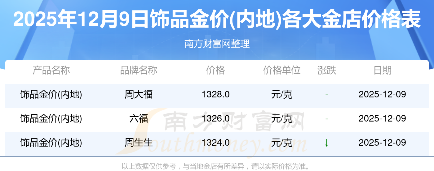 今天是2025年12月9日,周大福、周大福、周大福、周大福、周大福、周大福、周大福、周六福、周六福、周六福、周六福等各大金店品牌飾品金價(jià)(內(nèi)地)最新價(jià)格如下:周大福1328.0元/克、周大福669.0元/克、周大福1328.0元/克、周大福46520.0、周大福19190.0、周大福41960.0、周大福1165.0元/克、周六福1289.0元/克、周六福613.0元/克、周六福613.0元/克、周六福1184.0元/克。