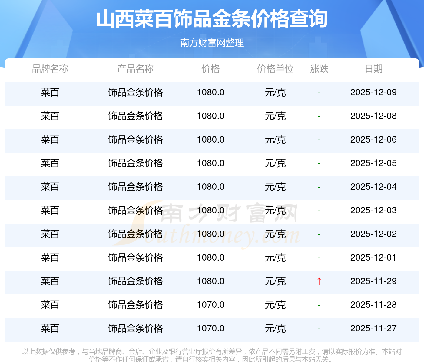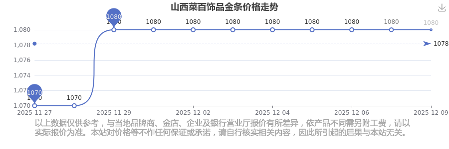 山西菜百飾品金條價(jià)格在 2025年12月9日,其市場(chǎng)價(jià)格為 1080.0元/克。
