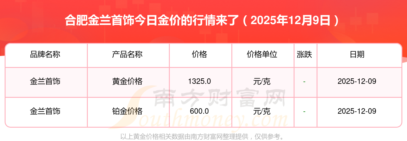 今日黃金售價(jià)是多少呢?此刻每克黃金價(jià)錢(qián)怎樣?2025年12月9日合肥金蘭首飾金價(jià)查詢:黃金價(jià)格1328.0元/克,鉑金價(jià)格669.0元/克,飾品金價(jià)(內(nèi)地)1328.0元/克,黃金飾品(香港)46520.0,鉑金價(jià)格(香港)19190.0,金條價(jià)格(香港)41960.0,金條金價(jià)(內(nèi)地)1165.0元/克,黃金價(jià)格1289.0元/克,鉑金價(jià)格613.0元/克,PT999鉑金價(jià)格613.0元/克,金條價(jià)格1184.0元/克。