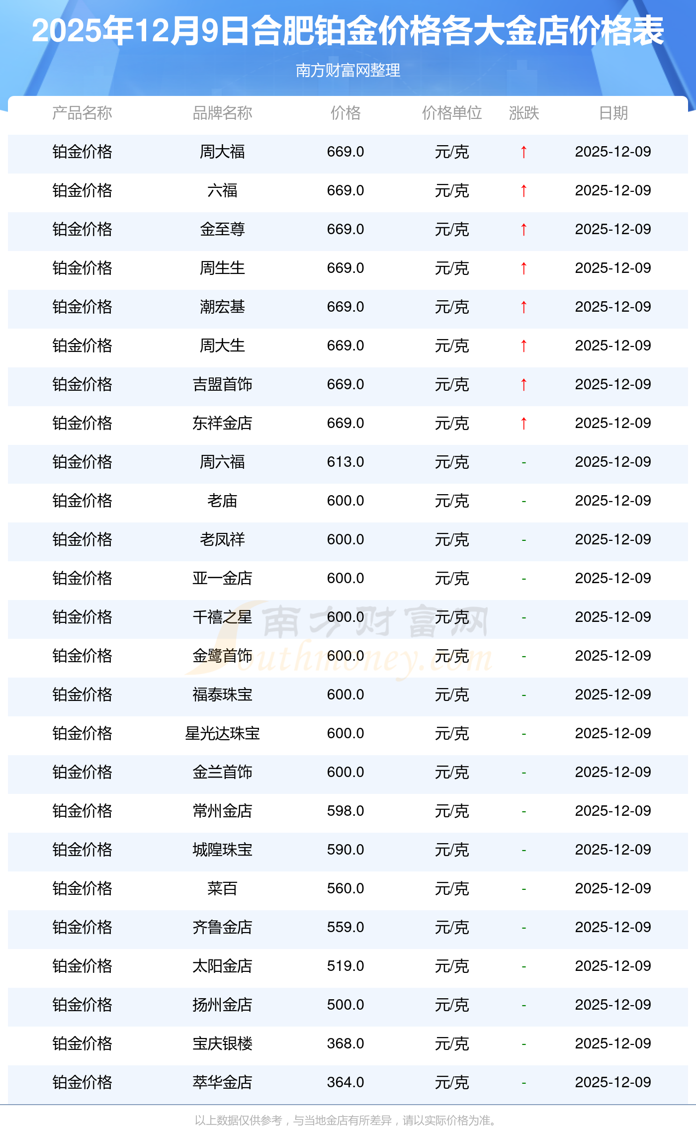 今天是2025年12月9日,合肥周大福、周大福、周大福、周大福、周大福、周大福、周大福、周六福、周六福、周六福、周六福等各大金店品牌鉑金價(jià)格最新價(jià)格如下:周大福1328.0元/克、周大福669.0元/克、周大福1328.0元/克、周大福46520.0、周大福19190.0、周大福41960.0、周大福1165.0元/克、周六福1289.0元/克、周六福613.0元/克、周六福613.0元/克、周六福1184.0元/克。