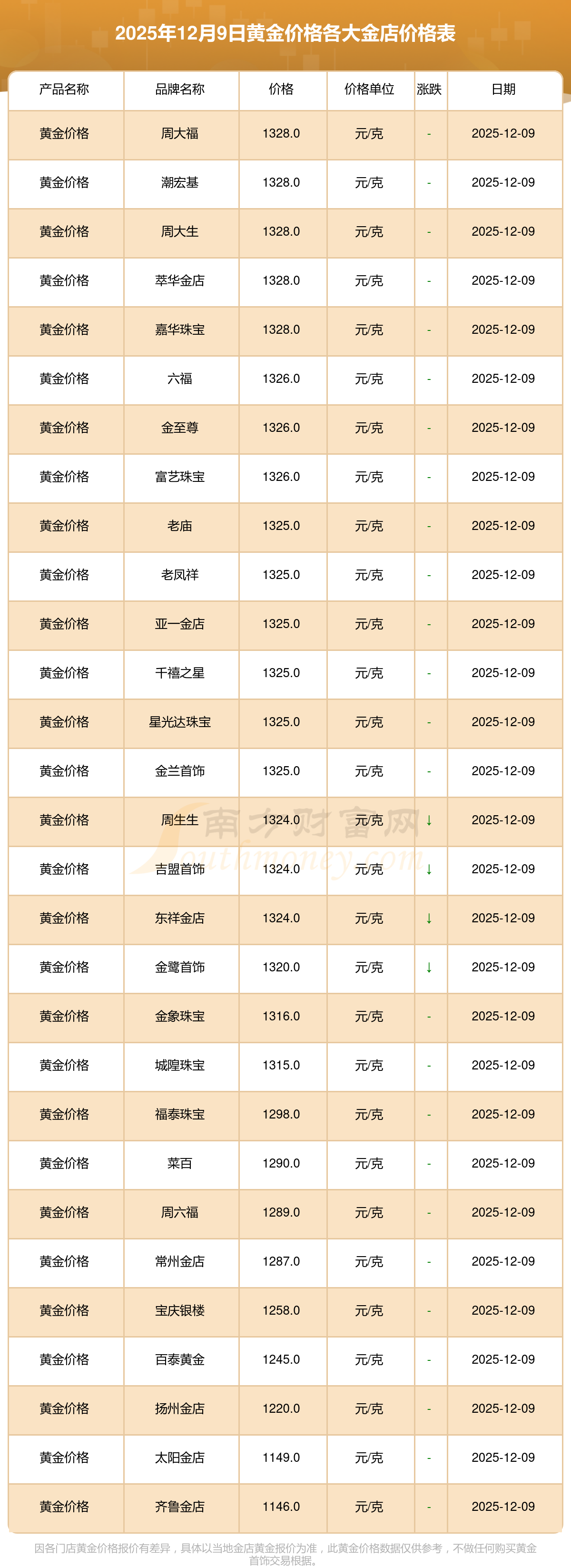 2025年12月9日周大福、周大福、周大福、周大福、周大福、周大福、周大福、周六福、周六福、周六福、周六福等各大金店品牌黃金價(jià)格最新價(jià)格如下:周大福黃金價(jià)格1328.0元/克,周大福鉑金價(jià)格669.0元/克,周大福飾品金價(jià)(內(nèi)地)1328.0元/克,周大福黃金飾品(香港)46520.0,周大福鉑金價(jià)格(香港)19190.0,周大福金條價(jià)格(香港)41960.0,周大福金條金價(jià)(內(nèi)地)1165.0元/克,周六福黃金價(jià)格1289.0元/克,周六福鉑金價(jià)格613.0元/克,周六福PT999鉑金價(jià)格613.0元/克,周六福金條價(jià)格1184.0元/克。