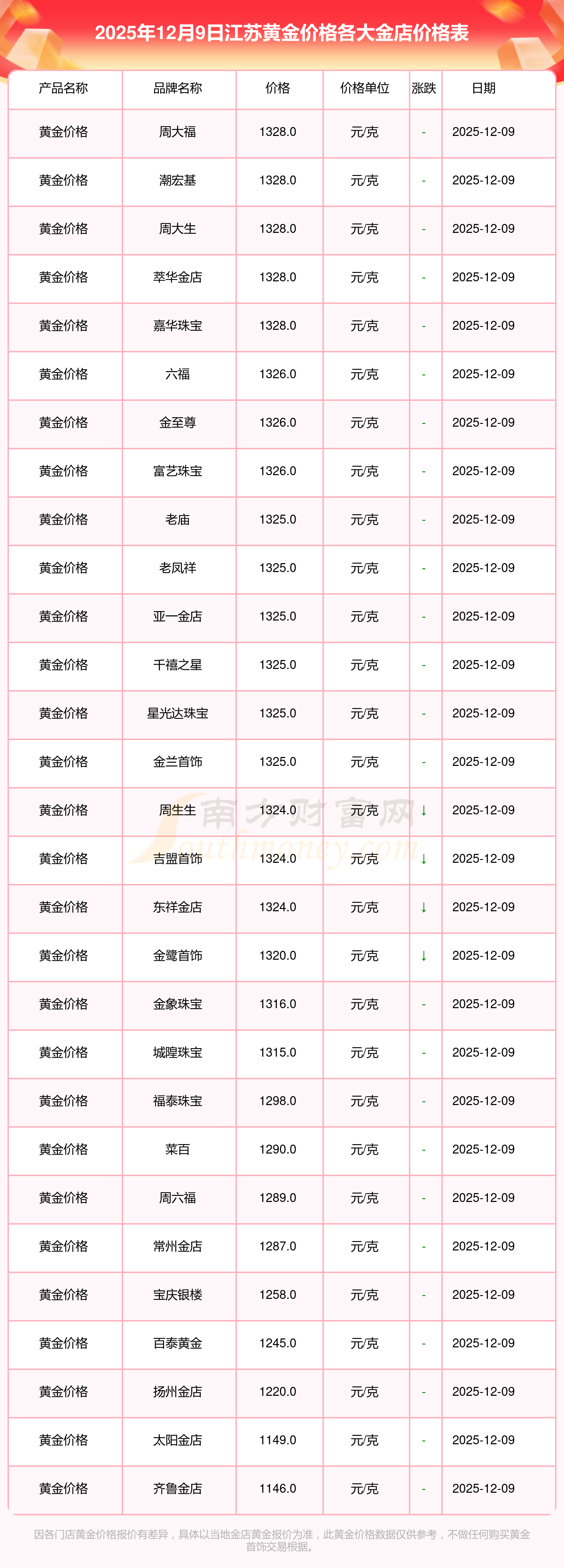 今天是2025年12月9日,江蘇周大福、周大福、周大福、周大福、周大福、周大福、周大福、周六福、周六福、周六福、周六福等各大金店品牌黃金價(jià)格最新價(jià)格如下:周大福1328.0元/克、周大福669.0元/克、周大福1328.0元/克、周大福46520.0、周大福19190.0、周大福41960.0、周大福1165.0元/克、周六福1289.0元/克、周六福613.0元/克、周六福613.0元/克、周六福1184.0元/克。