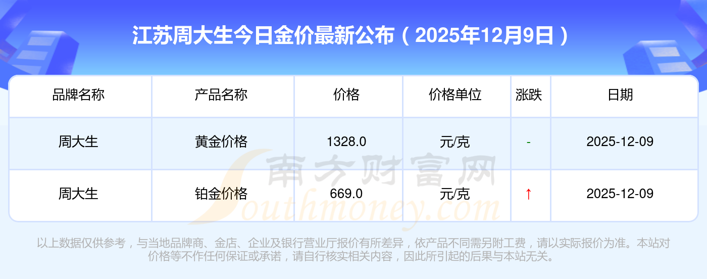2025年12月9日江蘇周大生今日價(jià)格:黃金價(jià)格1328.0元/克,鉑金價(jià)格669.0元/克,飾品金價(jià)(內(nèi)地)1328.0元/克,黃金飾品(香港)46520.0,鉑金價(jià)格(香港)19190.0,金條價(jià)格(香港)41960.0,金條金價(jià)(內(nèi)地)1165.0元/克,黃金價(jià)格1289.0元/克,鉑金價(jià)格613.0元/克,PT999鉑金價(jià)格613.0元/克,金條價(jià)格1184.0元/克。