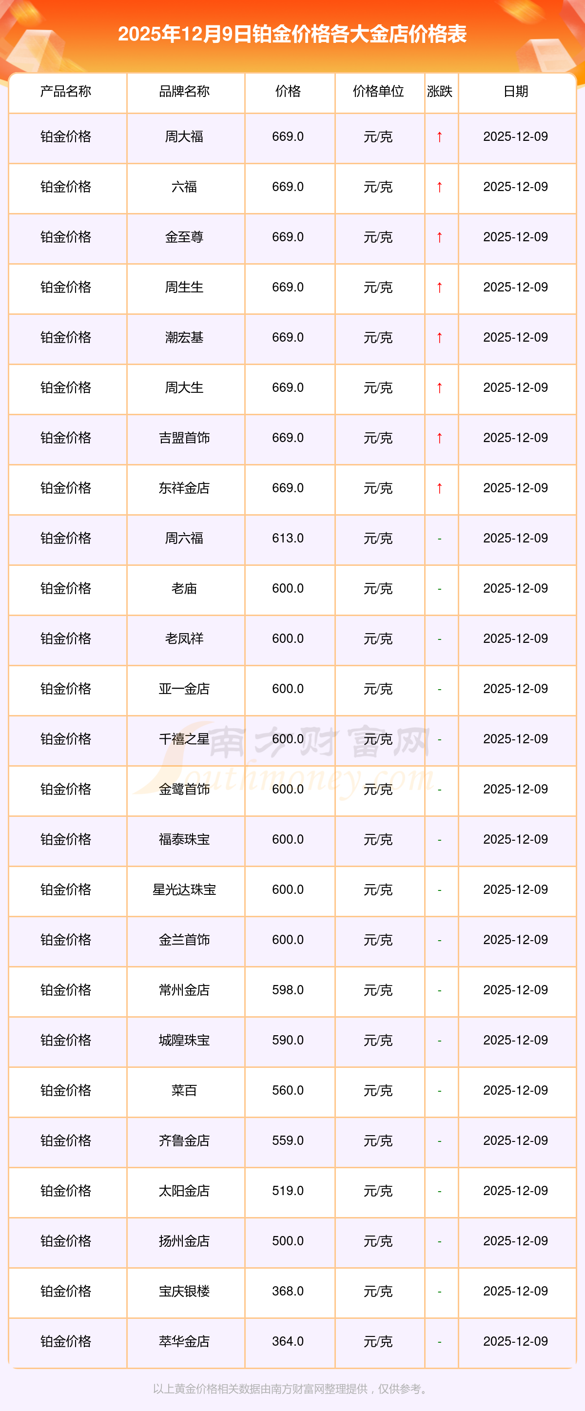 2025年12月9日各大金店鉑金價格最新價格:周大福1328.0元/克,周大福669.0元/克,周大福1328.0元/克,周大福46520.0,周大福19190.0,周大福41960.0,周大福1165.0元/克,周六福1289.0元/克,周六福613.0元/克,周六福613.0元/克,周六福1184.0元/克。