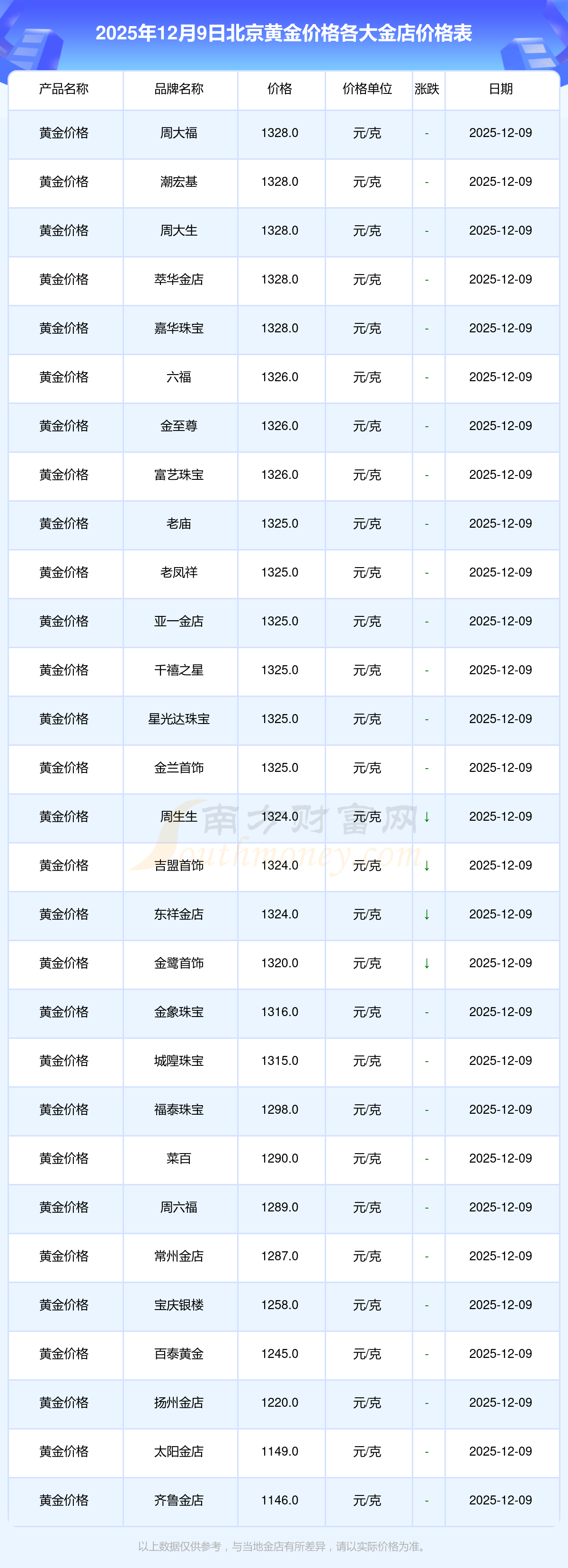 2025年12月9日北京周大福、周大福、周大福、周大福、周大福、周大福、周大福、周六福、周六福、周六福、周六福等各大金店品牌黃金價(jià)格最新價(jià)格行情來(lái)了,如下:周大福黃金價(jià)格1328.0元/克,周大福鉑金價(jià)格669.0元/克,周大福飾品金價(jià)(內(nèi)地)1328.0元/克,周大福黃金飾品(香港)46520.0,周大福鉑金價(jià)格(香港)19190.0,周大福金條價(jià)格(香港)41960.0,周大福金條金價(jià)(內(nèi)地)1165.0元/克,周六福黃金價(jià)格1289.0元/克,周六福鉑金價(jià)格613.0元/克,周六福PT999鉑金價(jià)格613.0元/克,周六福金條價(jià)格1184.0元/克。