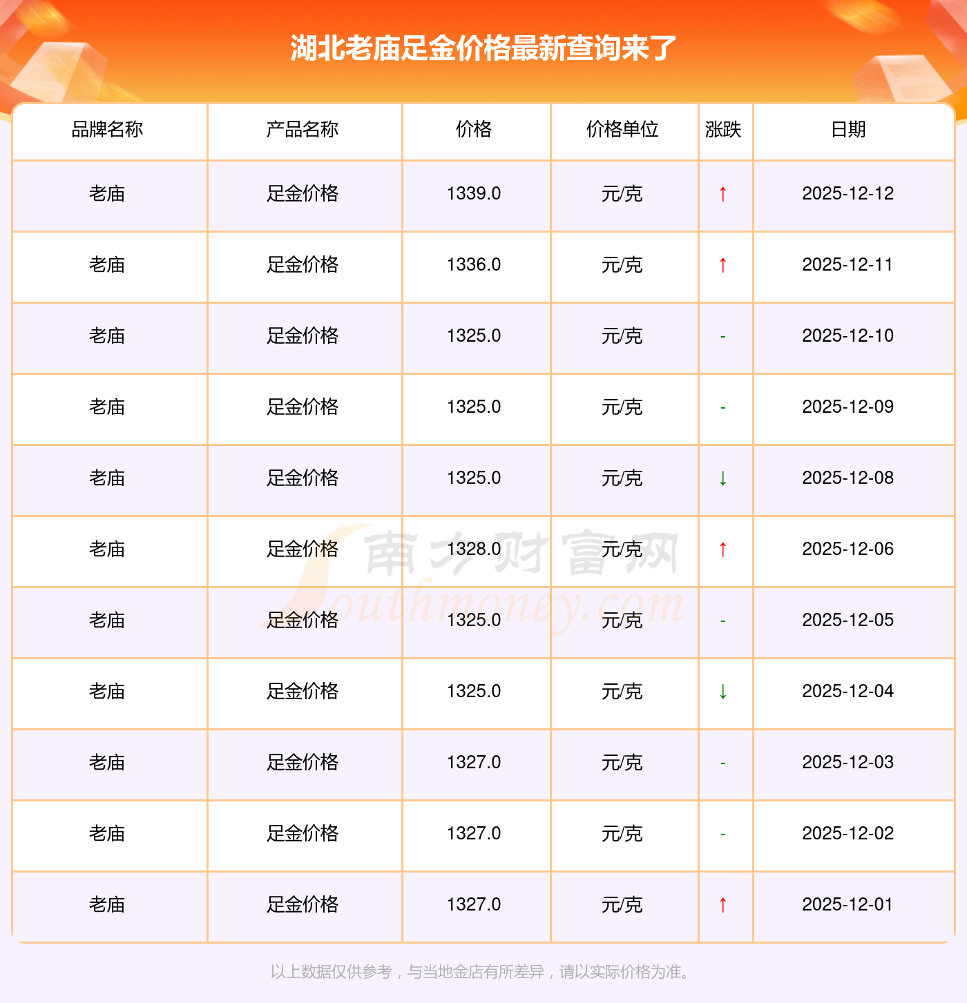 今天是2025年12月14日,周大福、周大福、老鳳祥、老鳳祥、老廟、老廟、周生生、周生生、周大福、周大福、周大福等各大金店品牌足金價格最新價格如下:周大福1336.0元/克、周大福681.0元/克、老鳳祥1337.0元/克、老鳳祥650.0元/克、老廟1339.0元/克、老廟600.0元/克、周生生1338.0元/克、周生生681.0元/克、周大福1336.0元/克、周大福47410.0、周大福19550.0。