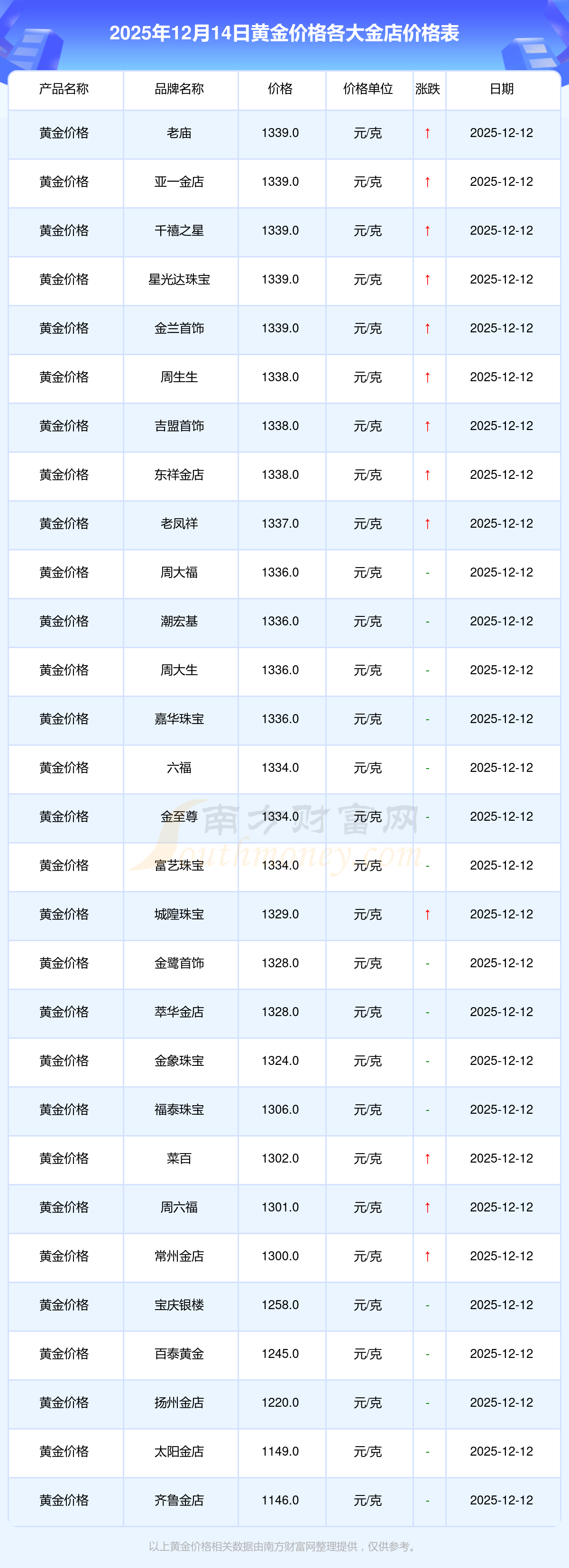 2025年12月14日周大福、周大福、老鳳祥、老鳳祥、老廟、老廟、周生生、周生生、周大福、周大福、周大福等各大金店品牌黃金價(jià)格最新價(jià)格如下:周大福黃金價(jià)格1336.0元/克,周大福鉑金價(jià)格681.0元/克,老鳳祥黃金價(jià)格1337.0元/克,老鳳祥鉑金價(jià)格650.0元/克,老廟黃金價(jià)格1339.0元/克,老廟鉑金價(jià)格600.0元/克,周生生黃金價(jià)格1338.0元/克,周生生鉑金價(jià)格681.0元/克,周大福飾品金價(jià)(內(nèi)地)1336.0元/克,周大福黃金飾品(香港)47410.0,周大福鉑金價(jià)格(香港)19550.0。