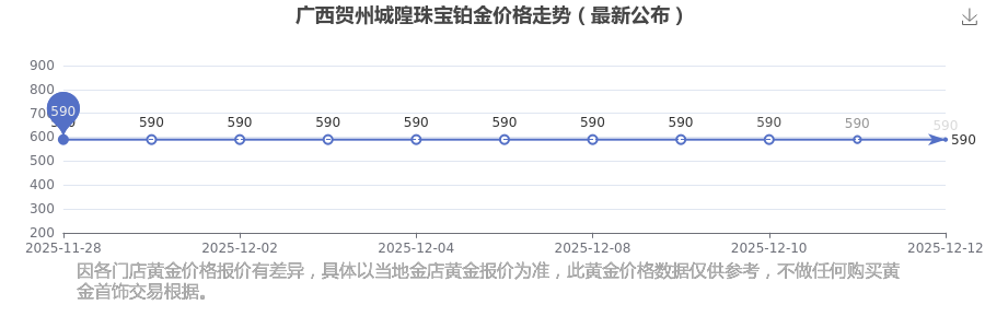 今日(2025年12月14日)廣西賀州城隍珠寶鉑金價格為590.0元/克。