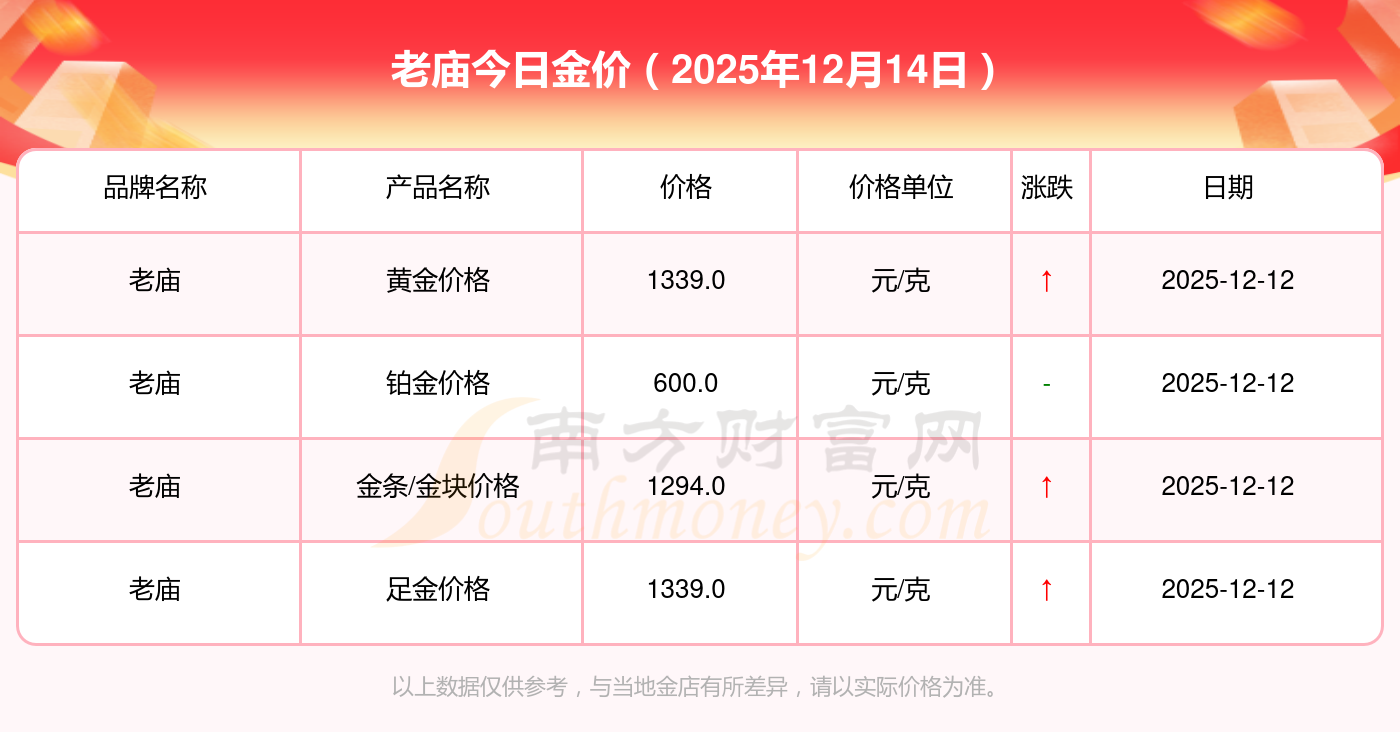 2025年12月14日老廟今日價格:黃金價格1336.0元/克,鉑金價格681.0元/克,黃金價格1337.0元/克,鉑金價格650.0元/克,黃金價格1339.0元/克,鉑金價格600.0元/克,黃金價格1338.0元/克,鉑金價格681.0元/克,飾品金價(內(nèi)地)1336.0元/克,黃金飾品(香港)47410.0,鉑金價格(香港)19550.0。