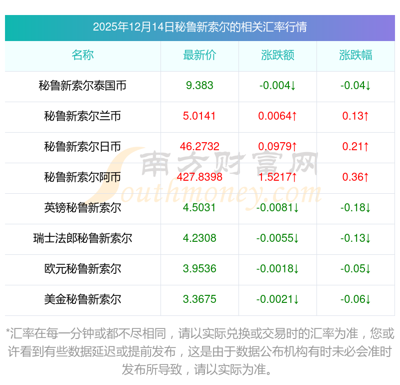 根據(jù)2025年12月14日匯率計算,PEN兌換BRL匯率最新價1.609200:今開價1.6092,昨收價1.6092,最高價1.6119,最低價1.5978。
