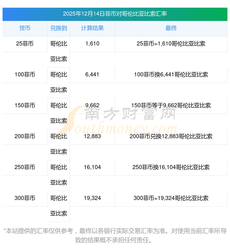 南方財(cái)富網(wǎng)為您提供菲幣兌換哥倫比亞比索匯率最新價(jià)格詳情。