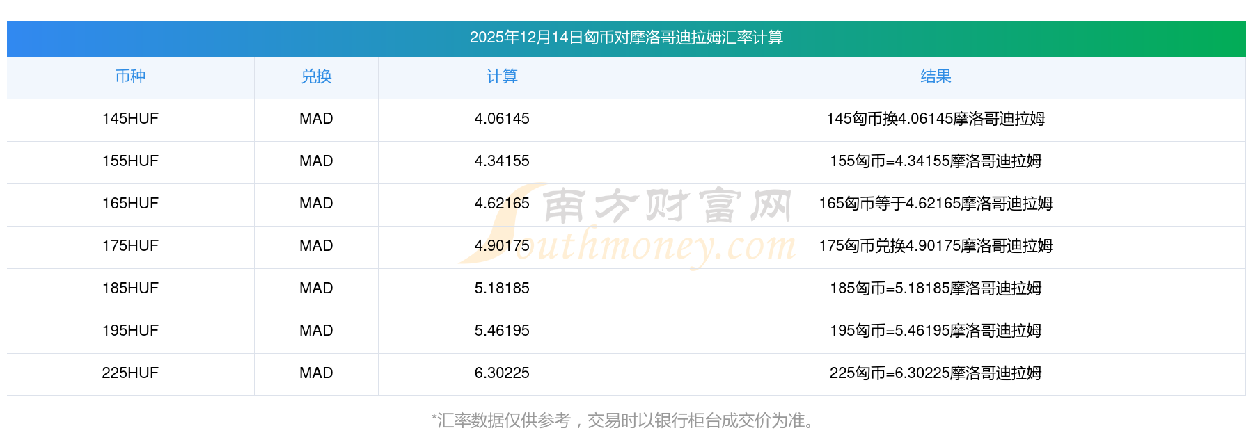 南方財(cái)富網(wǎng)為您提供匈幣對(duì)摩洛哥迪拉姆匯率最新價(jià)格詳情。