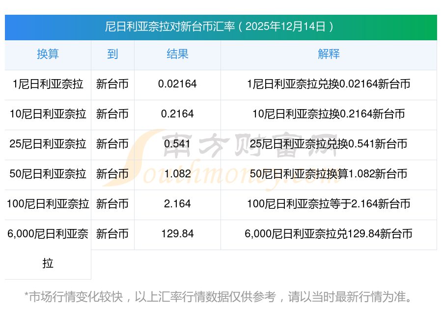 南方財(cái)富網(wǎng)為您提供尼日利亞奈拉對(duì)新臺(tái)幣匯率最新價(jià)格詳情。