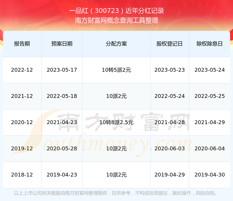 一品紅最新一次公布的分紅方案:10轉(zhuǎn)5派2元。