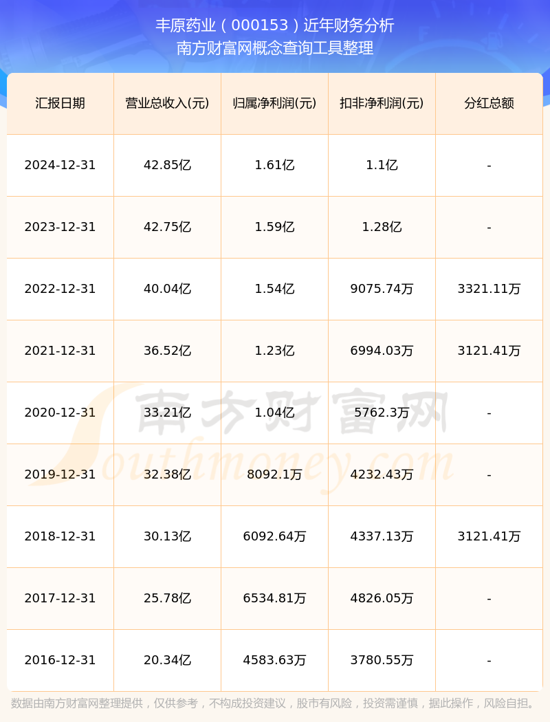 豐原藥業(yè)公司2024年實(shí)現(xiàn)營(yíng)業(yè)收入42.85億元,同比增長(zhǎng)0.21%;凈利潤(rùn)1.61億元,同比增長(zhǎng)0.97%;毛利率21.76%。